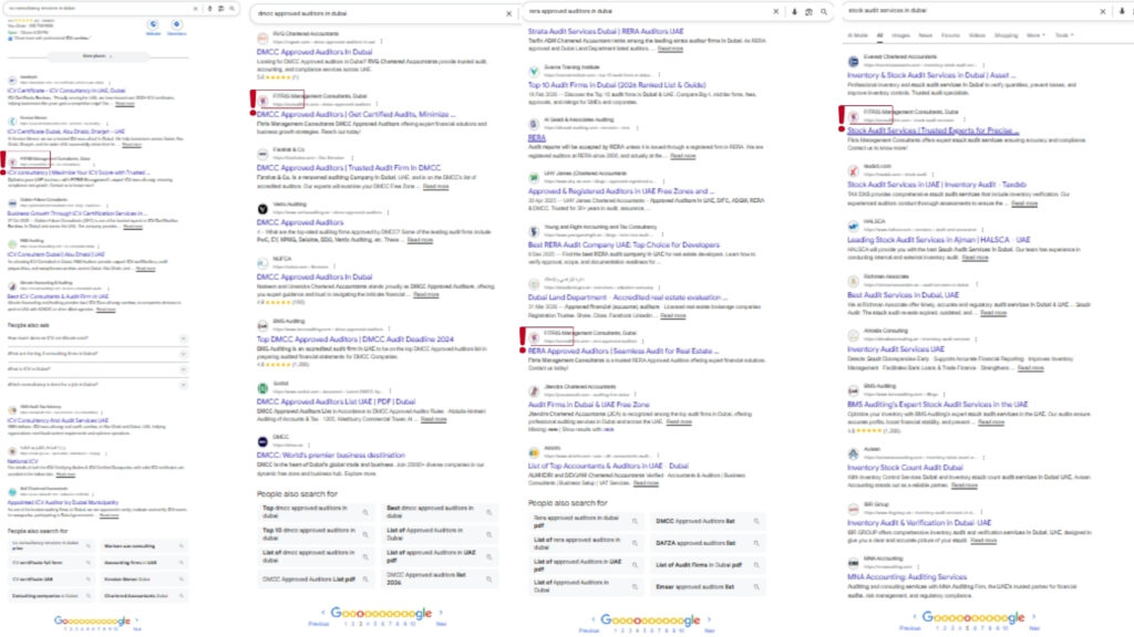 At FITRIS Management Consultants, I implemented a focused SEO strategy for a website with no existing SEO structure, targeting high-intent keywords related to consulting, auditing, and compliance services in Dubai. The work included service page optimization, technical SEO improvements, and content alignment based on user search intent to improve visibility for competitive industry terms such as “ICV Consultancy Services in Dubai,” “DMCC Approved Auditors in Dubai,” “CFO Services in Dubai,” and “Stock Audit Services in Dubai.”