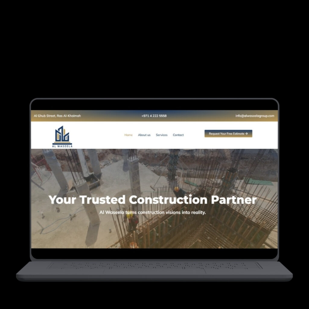 A corporate website for a construction company, showcasing services in building contracting, project execution, and engineering solutions with a clear and structured layout.